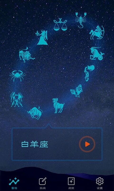 2、目前的星空冒险界面中,缓缓移动的是著名的黄道十二宫。十二个星座你可以首先玩一下自己的星座,把你的星座点亮并获得星座特色奖牌。