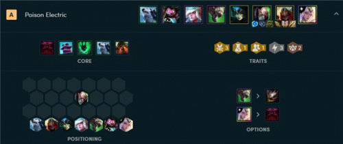 前期依然可以选择4守护神来作为前排,剧毒可以慢慢补充,几个雷霆英雄都可以作为输出核心增加暴击伤害,如果能够早点拿到拉克丝是做好,否则只好用奥恩代替。后期慢慢用5费的质量英雄来替换到阵容当中,等炼金和劫的装备都齐了应该可以走到最后