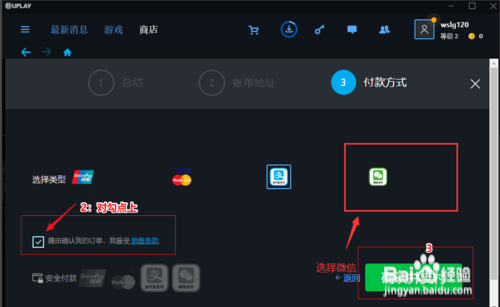 点击确认支付后,跳转至付款方式页面。我们选择微信,销售条款前面的勾点上,然后再次点击确认并支付。