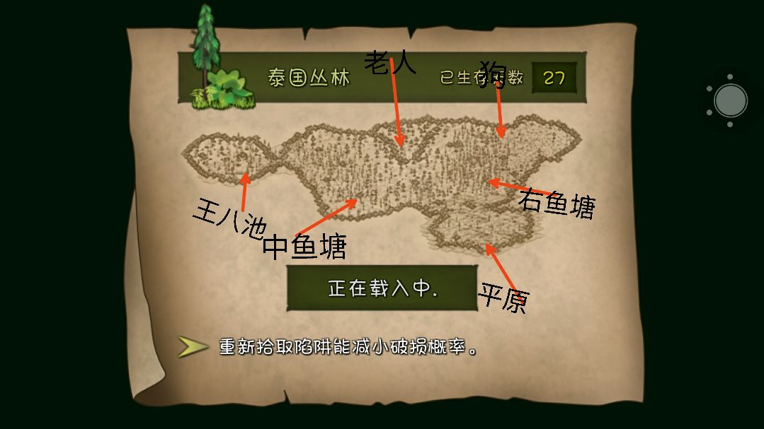 右鱼塘往右边是竹林,建议放三个陷阱抓竹鼠吃,竹林上方有狗隐藏任务前期不管。从竹林上方地图边缘往左走进V型山谷,山谷左边有生姜,谷中触发老人与狗任务。出山谷往左下到中鱼塘,建议放小网抓鱼虾做大餐。