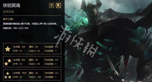 生命值:900护甲:35魔抗:20攻击力:90攻击速度:0.5攻击距离。
