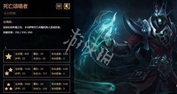 生命值:850护甲:25魔抗:20攻击力:65攻击速度:0.65攻击距离。