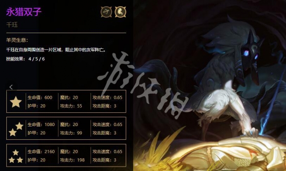 生命值:600护甲:20魔抗:20攻击力:55攻击速度:0.65攻击距离