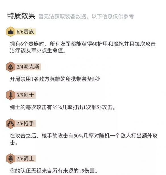 9.16版本中贵族羁绊的到了进一步的加强,6贵族羁绊下所有友军获得70护甲和魔抗并且每次攻击治疗该友军35点生命值,但是拳头对这一改动进行了热修,调整回来原本的60双抗,但是就算这样,海克斯+贵族的阵容依旧是当前版本非常火热的吃鸡阵容!