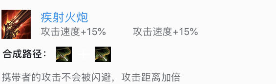 携带者攻击无法闪避,攻击距离翻倍,作用简单粗暴,适用于各种后排主C英雄,甚至某些近战主C也能使用。