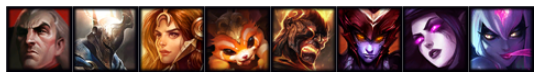 英雄分别为:伊芙琳、莫甘娜、火男、乌鸦、纳尔、龙女、潘森、蕾欧娜。