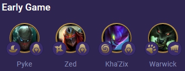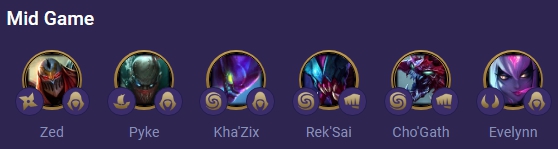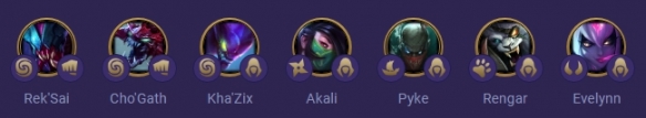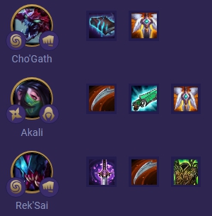 虚空英雄中大虫子的AOE击飞和伤害依旧非常关键,能为刺客收割提供环境,复活甲+鬼书即可,而阿卡丽和雷克塞装备大同小异,龙牙能够克制目前火热的恶魔体系。