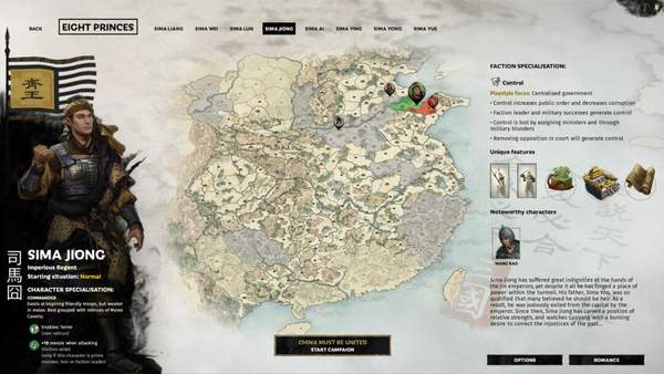 作为齐王,司马冏的初始位置非常有利,同时占领北海和泰山两郡以及它们的贸易港口。不仅地理位置十分安逸,他也能自由前往首都,但当他要前往地图的中间区域时就需要提防点其它势力了。如果玩家想要体验一人统治一个派系、权倾朝野般的感觉,那么他是最合适的选择了。