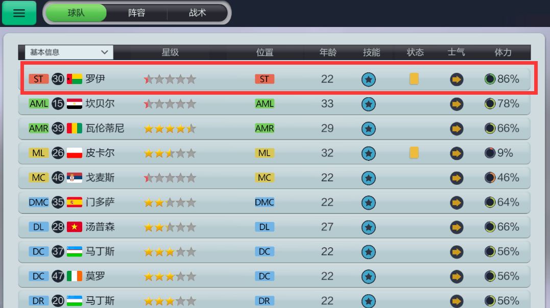 3. 状态栏显示球员的三种状态:体力、伤病、士气。