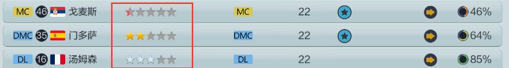 球员的星级由球员平均属性决定,每20%能力代表一颗星,5星以下显示白星,5星至10星为黄星,10星以上为红星。