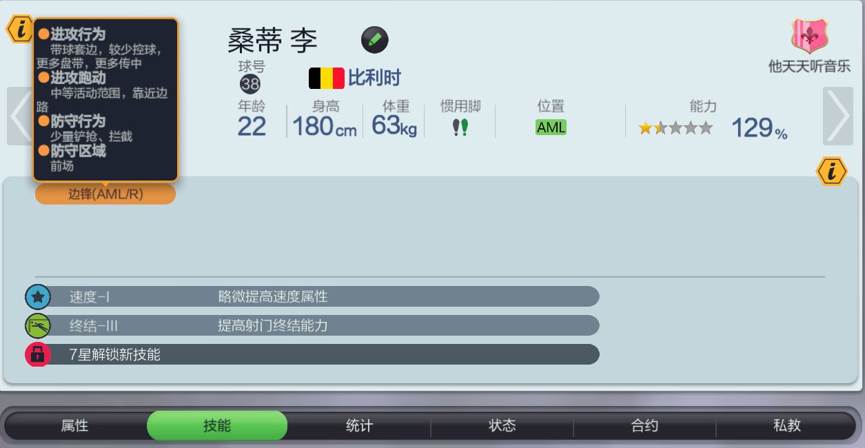技能也是球员信息里的重要部分。每位球员所拥有的技能最多为5个,分别在3、5、7、9、10星解锁,每个技能分为5个等级,技能分为属性技能和行为技能。其中属性技能为蓝色,行为技能为绿色。行为技能会直接加强对应行为的效果,属性技能是通过提升属性从而间接加强与该属性相关的行为,所以与球员倾向的行为相匹配的行为技能是最佳选择。第一个技能一定是属性技能,第五个技能概率出队长技能,第2、3、4个技能在属性技能和行为技能中随机。队长技能是对全体球员生效的行为技能,需要把该球员设置为队伍队长,球队中最多只能有一个队长技能生效。