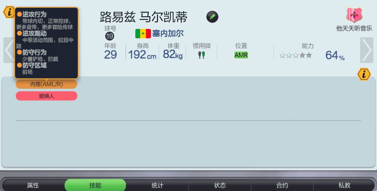 3.接着是球员信息里最重要的部分-球员属性。球员属性分为技术属性(10种)与身心属性(5种)。每种属性的具体作用可以点击属性栏右上角的提示按钮进行查看,比如防守行为与抢断,铲球,预判,力量有关,进攻行为与技术,盘带,平衡,爆发力有关。