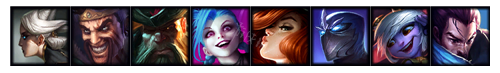 英雄分别为:女枪、金克丝、小炮、船长、亚索、德莱文、慎、卡蜜尔。