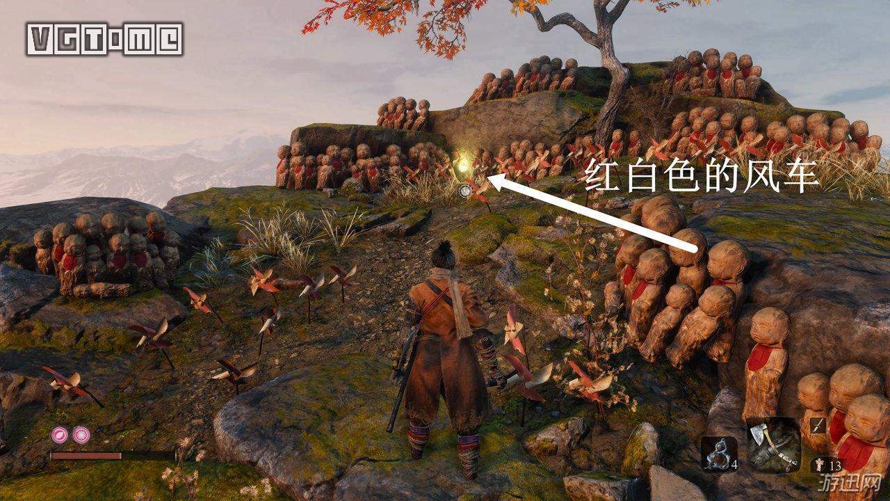 到下图位置,前方悬崖边,捡到红白色的风车。