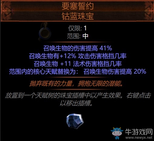 放置到一个天赋树的珠宝插槽中以产生效果。右键点击以移出插槽。
