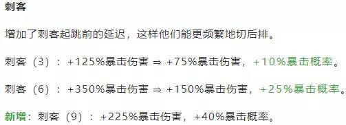 刺客羁绊得到了一次很大的改动,暴击伤害降低但是增加了暴击几率,6刺客时每位刺客自身带有的25%暴击几率再加上羁绊提供的25%暴击几率就有50%的暴击几率,所以相比之前版本来说神圣之剑的优先级会降低,而无尽之刃的优先级将被提升。