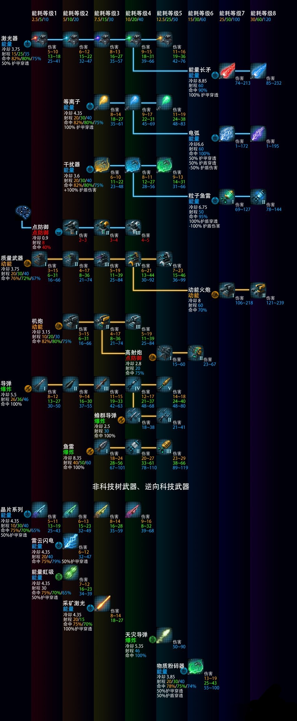 如果把S看做1格,M看做2格而L看做4格的话,将游戏里所有的武器的能耗除以占用格数就只有8种不同的等级,我就以此为依据将武器分为八个等级,并结合stellariswiki里的资料,把它们的先后关系整理了一番。为什么不写舰载机因为不知道怎么归类也不喜欢舰载机。