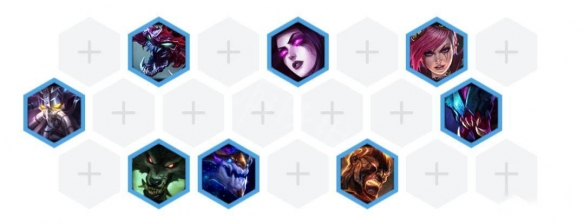 标准阵容:大虫子、挖掘机、蔚、狼人、卡萨丁、莫甘娜、火男、龙王。