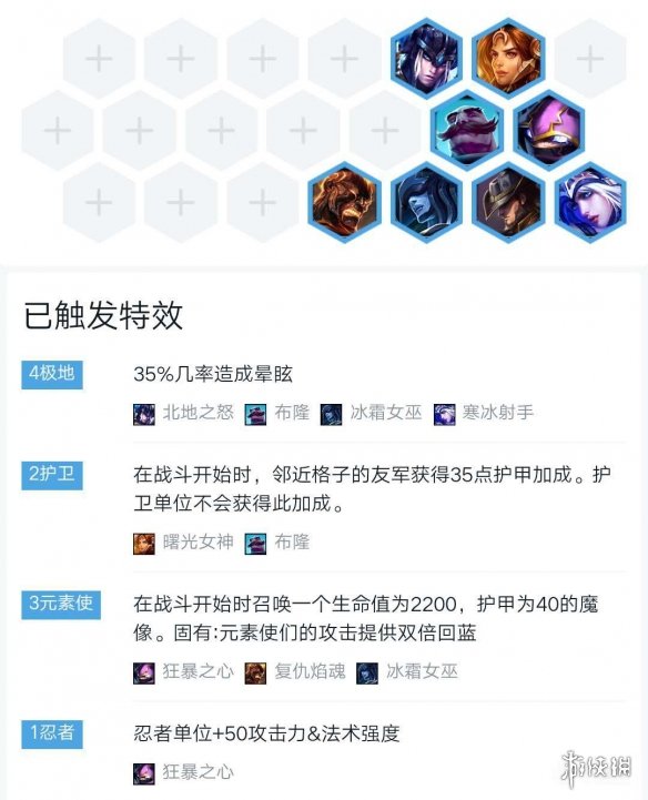现在羁绊是4极地和三元素,在来考虑7人口与8人口上什么高质量单卡。拥有4极地的情况下控制很足伤害也不错,可补羁绊:骑士、护卫、。
