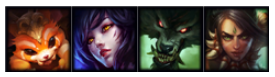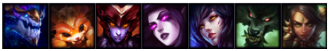 英雄分别为:沃里克、奈德丽、阿狸、纳尔、希瓦娜、龙王、莫甘娜。