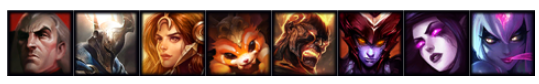 英雄分别为:伊芙琳、莫甘娜、火男、乌鸦、纳尔、龙女、潘森、蕾欧娜。