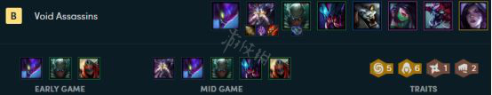 卡莎在现在的版本中最妥的就是配合虚空的阵容来打,现在走纯虚空的阵容配合六刺客能打出高额的输出效果,不过卡莎作为五费卡追高费比较难所以一般不吃装备可以给到卡萨丁神装让卡萨丁去充当主C的牌进攻效率也非常的高,卡萨丁的进攻、爆发的效果非常强。