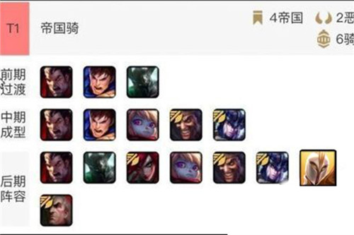 前期使用骑士英雄进行过渡,快速升到6级寻找核心英雄德莱文。 阵容的核心英雄为卡特、德莱文和乌鸦,尤其是乌鸦和德莱文,后期坦度和输出都非常充足。德莱文没来之前可以依靠卡特作为输出点,德莱文来了之后可以替换成德莱文。如果你只拥有三帝国迟迟没来乌鸦,建议只上场2帝国。