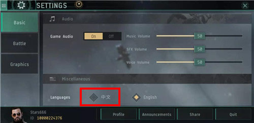 打开设置之后我们就可以看到基础设置下方的语言设置,目前游戏中只提供中文和英文两种默认的语言设置,我们只要点击左边的“中文”就可以将游戏的语言设置成中文了。