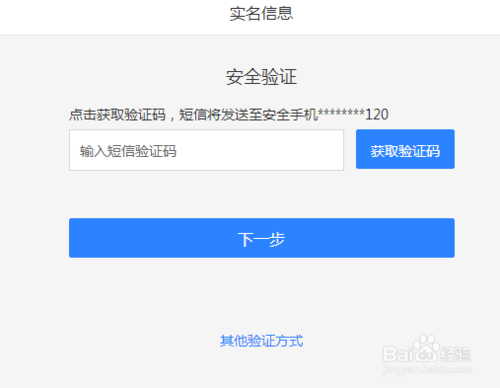 点击“实名信息”,弹出实名信息的安全验证页面,在页面上获取并输入手机验证码。
