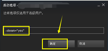 在文本框输入-steam="yes"点击确定按钮,这样就是正版的了,不会影响你的steam成就,如下图所示