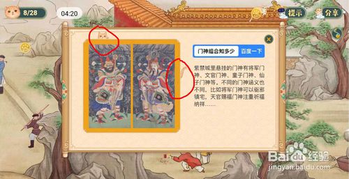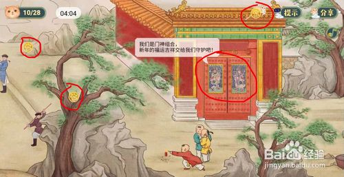 第二步,进入第二个界面,有两只隐蔽的猫是躲在门神组合的画面里面。点击门神,即可发现。