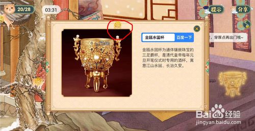 第四步,这个界面的一只猫隐藏在金瓯永固杯中,点开杯子即可找到。