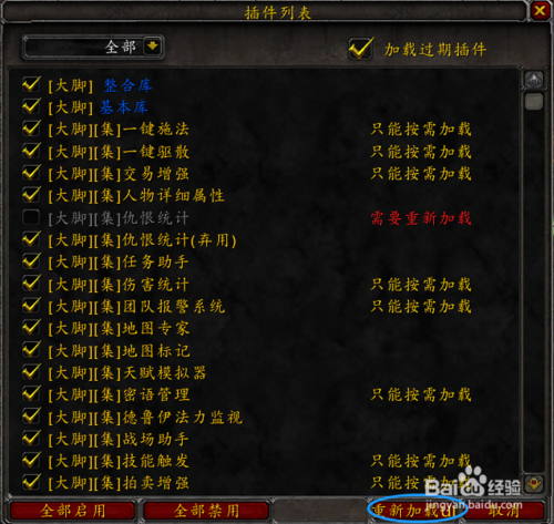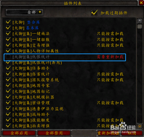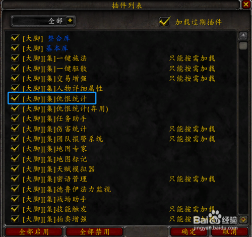 4、将“【大脚】【集】仇恨统计”取消勾选;