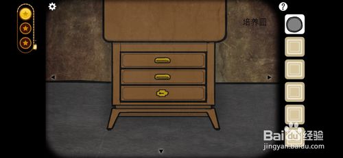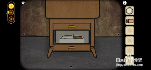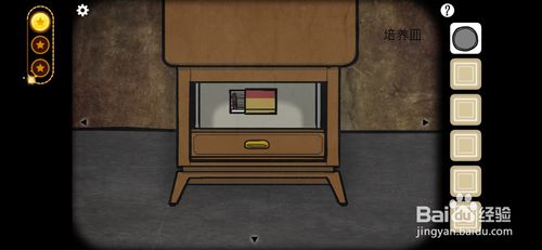 点击右侧的柜子,拿到柜子上的培养皿。打开第一层抽屉,得到一盒火柴。打开第二层抽屉,得到一把匕首。