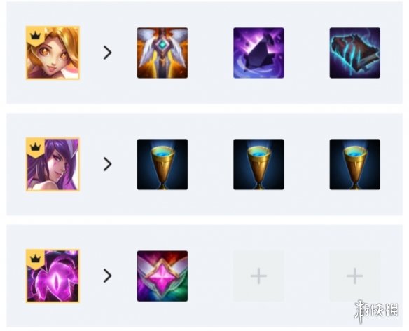在10.8b版本更新后,双炽天使已经不能满足辛德拉的技能释放效率,而三圣杯可增加全团启动效率,一人释放技能全员开始技能轰炸模式。